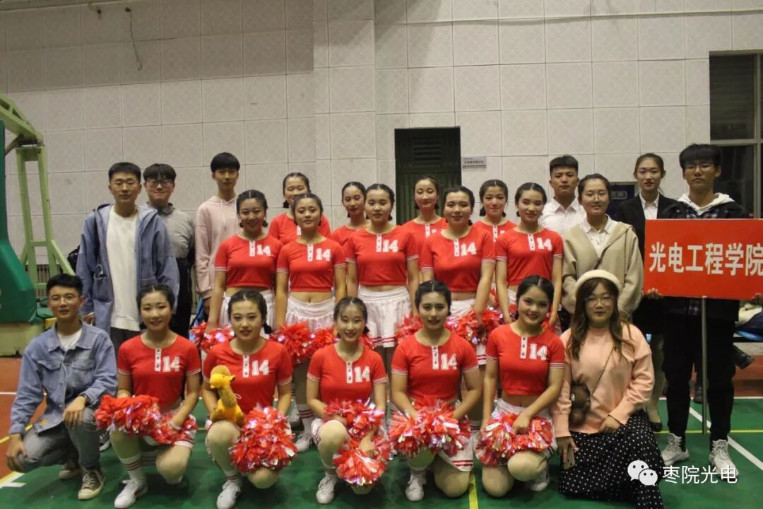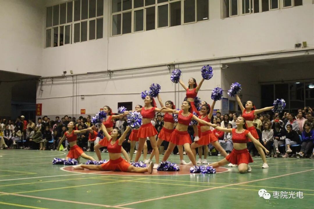 看,那是光电的篮球宝贝!整齐划一的动作,优美如画的舞姿,赢得了台下观众的阵阵掌声。当光电的篮球宝贝放下手中彩球,舞起红绢时,舞蹈瞬间由现代舞变成民族舞,她们轻步曼舞如飞燕伏巢,美丽的舞姿闲婉柔靡,赢得了台下观众热烈的欢呼声。我院精彩的表演获得了裁判员9.01的高分。