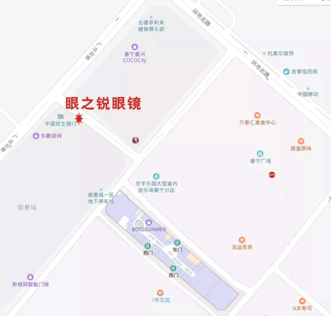 本店主营近视镜、太阳镜、隐形眼镜、护理液等。免费提供验光、清洗、校正、修理。店址:普宁市流沙御景城一期56号(即民生银行旁边,COCOCity 2号门又一茶斜对面)。电话:0663-2505368