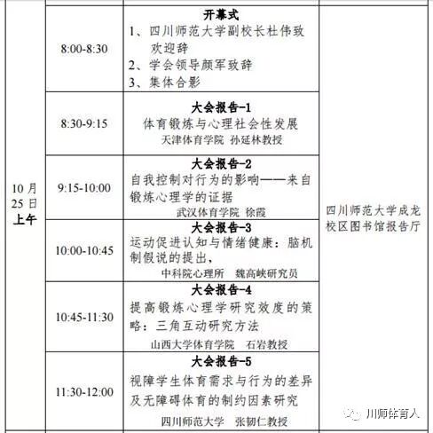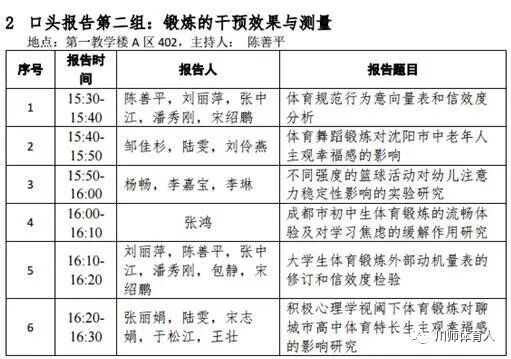 为了探讨体育锻炼与心理健康的关系,促进身体锻炼心理研究成果的交流和学术研究的进一步深化,“第六届全国体育锻炼与心理健康学术会议”在2019 年 10 月 24 日-10 月 27 日在四川师范大学成龙校区隆重举行。此次会议由中国体育科学学会运动心理学分会、中国心理学会体育运动心理专业委员会主办,四川师范大学体育学院承办。