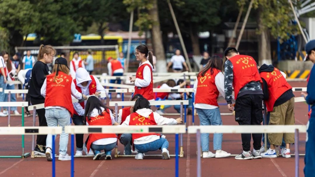 操场上流动的红色小马甲,是校运会亮眼的标志。50名来自校青年志愿者协会的志愿者们协同裁判员工作,提供无微不至的帮助,维护了每一场比赛的秩序。