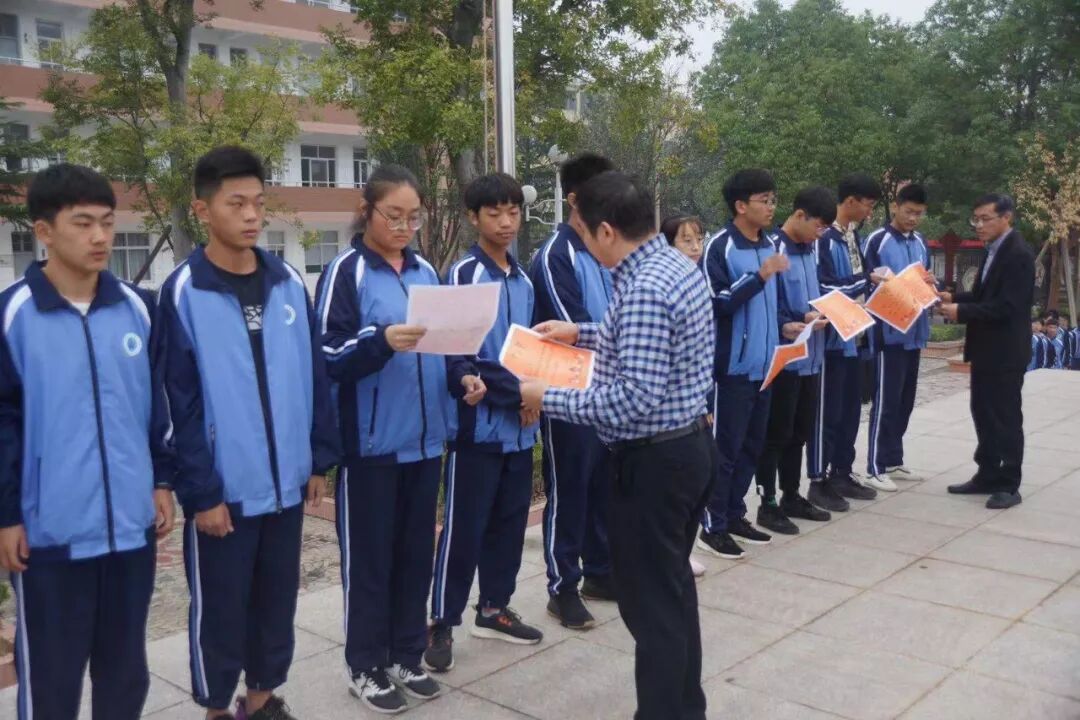 本次秋季田径、趣味运动会表彰了各年级团体总分前4名班级和各单项比赛前六名学生。学校团委和体育教研室一同评选出运动会的精神文明奖班级及精神文明裁判员。首先,由学校体育教研室王林宝老师宣读了本次比赛取得个人单项前三名的运动员名单,公道中学李兆兵副校长宣读了本次运动会各年级取得前四名的班级及优秀组织和精神文明奖班级名单以及精神文明裁判员名单。接着由学校沈文涛校长等学校领导为获奖班级和个人颁发荣誉奖状。