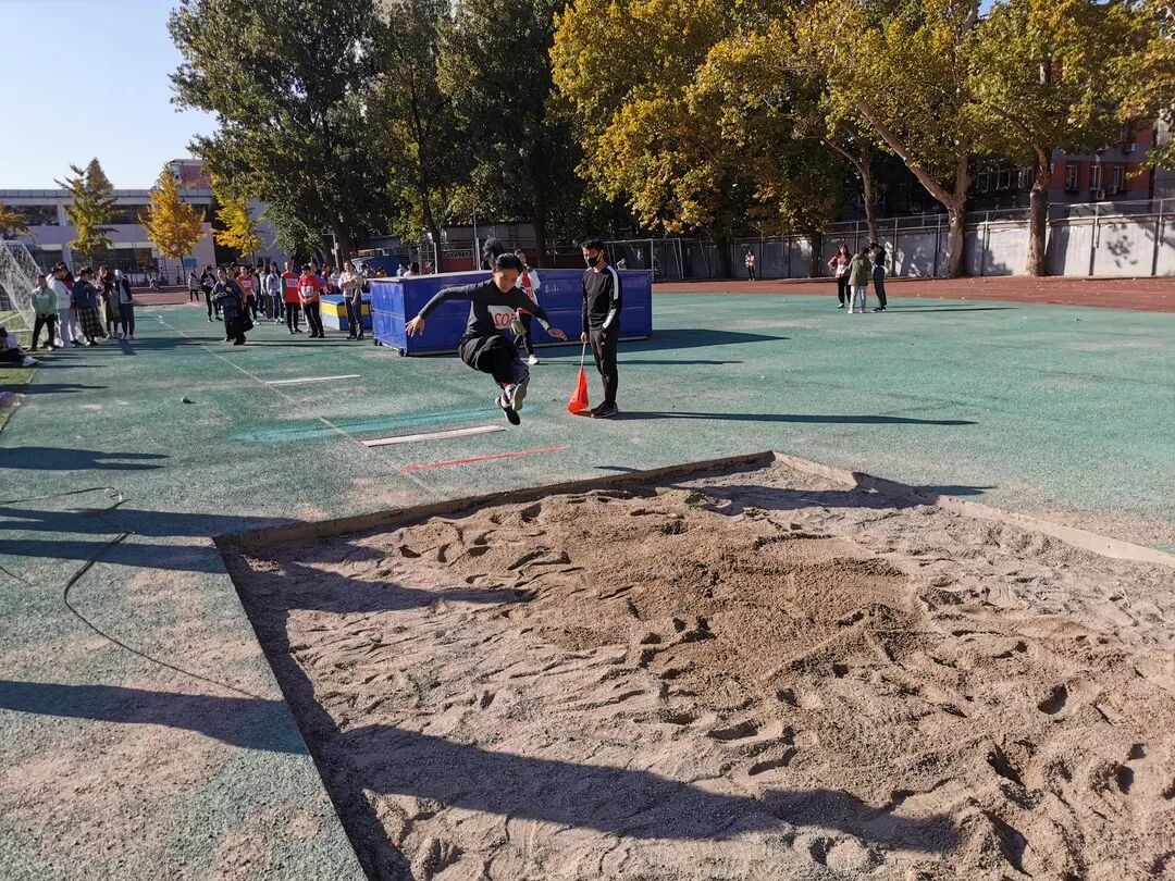 跳远是最古老的竞技项目之一,由助跑、起跳、腾空和落地等动作组合而成。比赛开始,参赛选手们都卯足了劲,力争拿到最佳的成绩。比赛中不乏有些同学做到了一整套跳远动作行云流水、一气呵成,颇有专业运动员的风范,他们的精彩表现吸引了大批观众的目光。