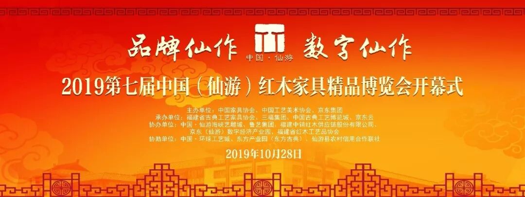 10月28日至11月1日,2019第七届中国(仙游)红木家具精品博览会京东·仙作数字经济发展大会(简称2019仙游红博会)将在福建仙游盛大召开。本届仙游红博会以“品牌仙作 数字仙作”为主题,由中国家具协会、中国工艺美术协会、京东集团主办,福建省古典工艺家具协会、三福集团、中国古典工艺博览城、京东云承办。作为红木业界极具影响力和号召力的全国性专业展会和文化盛会,2019仙游红博会旨在推动“仙作”工艺美术产业在数字时代,实现转型升级、提质增效、做大做强,打造全球工艺美术第一品牌。