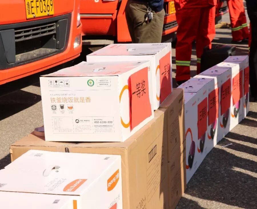 竞赛组织5支队伍,20名参赛选手在指定位置使用自己的清扫工具,两分钟内将指定区域清扫干净、倒入塑料袋内并将清扫工具放回原位。用时最短、石子回收质量最高、清扫质量最优者获胜。一等奖电饭煲二等奖电饭锅三等奖电饼铛赛前,大家斗志昂扬