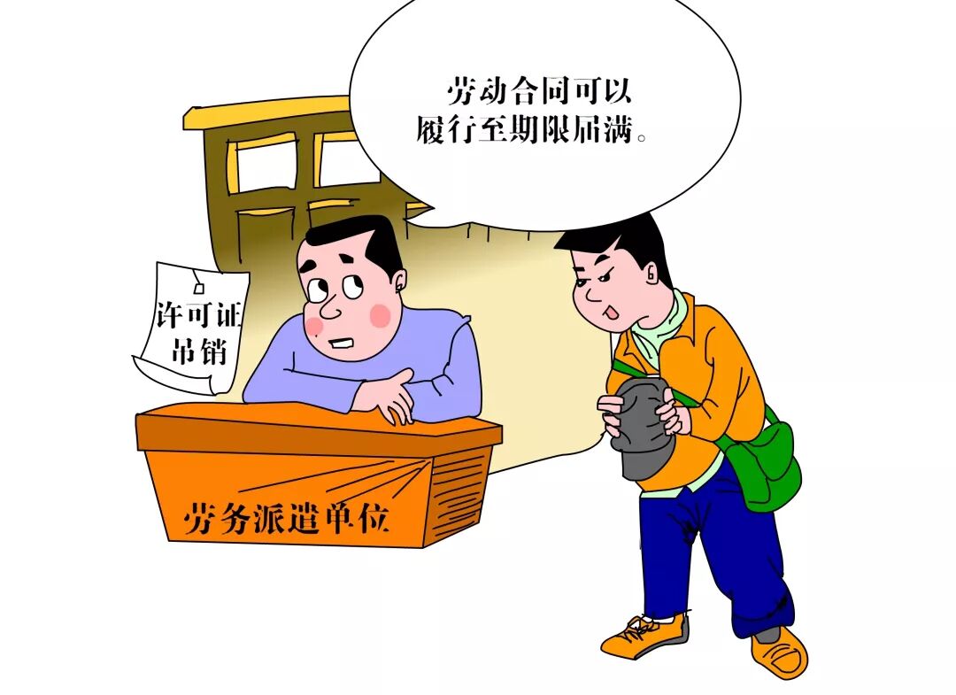 《劳务派遣暂行规定》第十一条规定:“劳务派遣单位行政许可有效期未延续或者《劳务派遣经营许可证》被撤销、吊销的,已经与被派遣劳动者依法订立的劳动合同应当履行至期限届满。双方经协商致,可以解除劳动合同。”