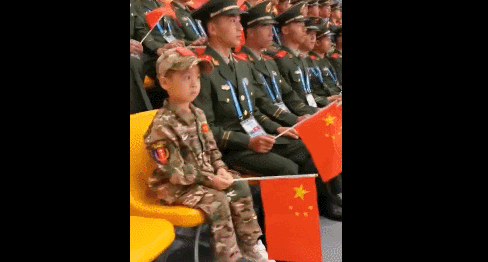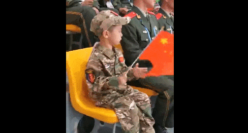 最让人忍俊不禁的一幕是,小军迷的动作和兵哥哥的动作始终保持高度一致,拍手的频率、国旗的高度,就连放手的姿势……通通都要向战士看齐。