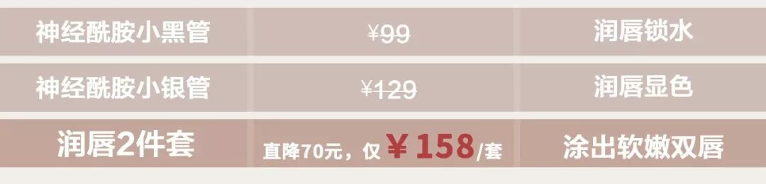润唇2件套(日常款+变色款 )推荐指数:????日常价?228/套组合直降70元,仅?158/套!