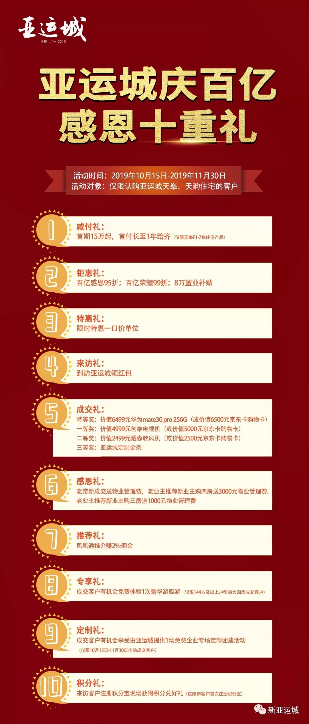 有兴趣的街坊,就抓紧时间去亚运城销售中心看看啦~10月15日至11月30日期间认购,可享受十重好礼,购房惊喜请查收: