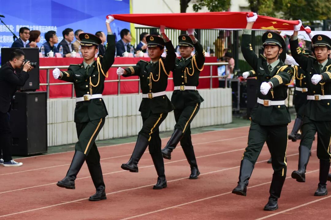 身穿墨绿色军装,脚踏黑色皮靴,护旗手们雄赳赳气昂昂地从主席台前走过,在嘹亮的国歌声中将五星红旗冉冉升起。