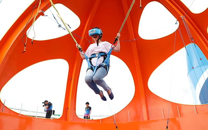 在做准备工作的时候,猪猪内心还觉得有点怕怕的,不过一戴上VR眼镜之后,你就会被瞬间“吸”入游戏中,随着画面用力跳跃,当你脚尖触碰到蹦床时还没发力就已经被弹回去了,如果你想蹦的很高可不是件简单的事儿哦~