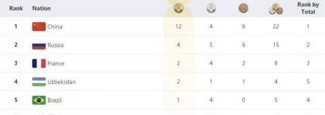 19日比赛结束后,中国军团以12金、4银、6铜的成绩暂居金牌榜、奖牌榜第一。