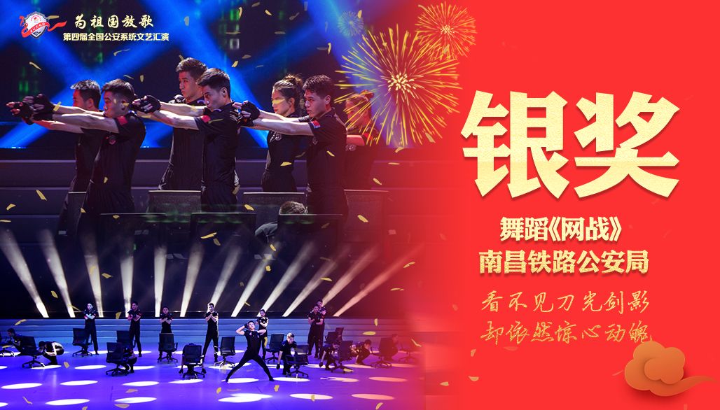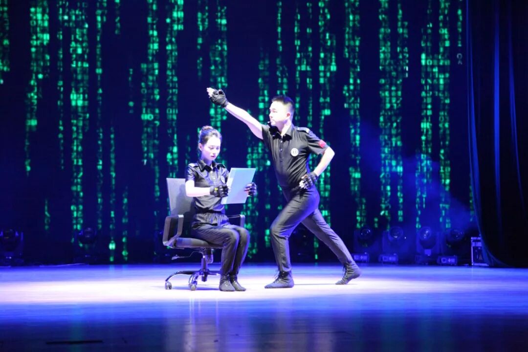 舞蹈《网战》运用激光手套,织成光效网络,展示在大数据时代背景下,铁路公安在网络安全的战斗中,用这张无形而有力的网打响了一场场围剿犯罪的战斗。