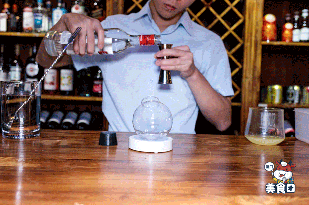 颜值和名字都惊艳到我了!倒入湛蓝色的蓝橙酒液、搅拌,调酒师的每一个动作都干净利落,停顿间都是惊喜。甜甜的口感,就像喝的是果汁气泡水,超适合女生pick~
