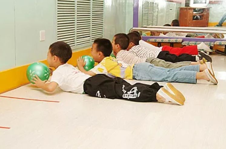 把坐垫放在距墙约2—3米远的位置。让孩子趴在坐垫上,只有肚子着地,头、上肢、小腿及脚都抬起来,手心向前,两手五指相对,然后把球推向墙壁,待弹回后,再连续推50—100次,速度由慢到快。距离由近及远,并随熟练程度来调整。