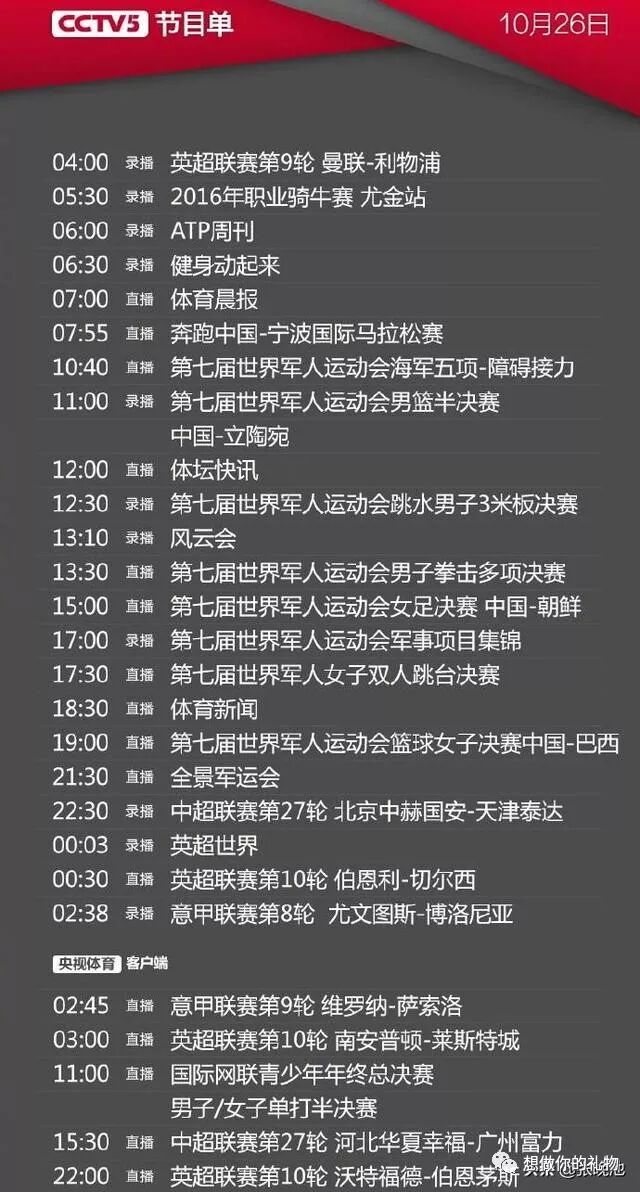 10月26日上午7时55分,央视体育频道CCTV5直播奔跑中国-宁波国际马拉松赛。10时40分,直播第七届世界军人运动会海军五项-障碍接力。下午13时30分直播军运会男子拳击多项决赛。