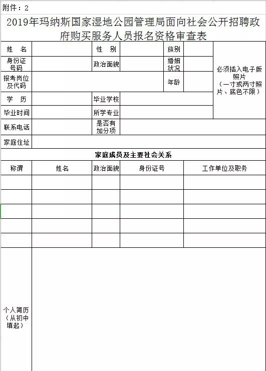 2.2019年玛纳斯国家湿地公园管理局面向社会公开招聘政府购买服务人员报名资格审查表