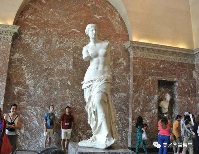 1号相机(平视)测量出了7个半头高,2号相机(俯视)测量出了3个半头高,3号相机(仰视)测出了8个半头高,由此可以说明,以任意视角的照片用来测量是不准确的。我们再来看一下断臂维纳斯在卢浮宫展厅里的陈列状态。