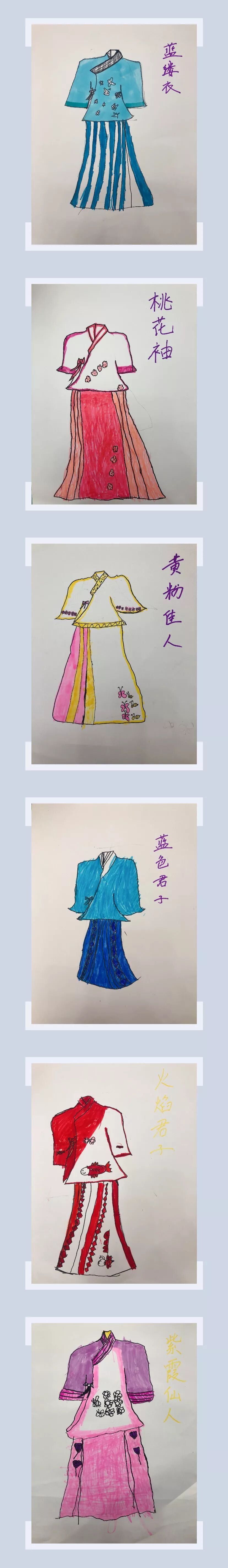 今天老师带领大家认识和了解了汉服的悠久历史并进一步解析了汉服的服饰特点和设计构造,接着小朋友们便开始大胆下笔进行创作。汉服的绘制分上下两部分进行,上体的领口和斜襟部位需重点刻画其特点,而下体裙摆层层叠叠的飘逸感需要小朋友们用线条去表达。在完成基础底稿设计后用水彩笔进行涂色,再适当加上小朋友们自己喜欢的图案,一件件特色鲜明的华服在小朋友们笔下熠熠生辉!