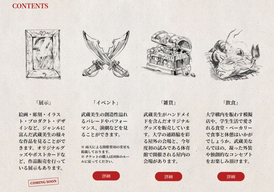 艺术祭会场的装饰和活动是其特色,有从时装秀、摔交表演赛、传统祭奠、模拟商业街,研讨会等丰富多彩的由学生主办的活动。