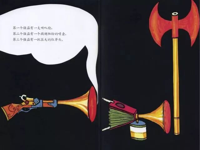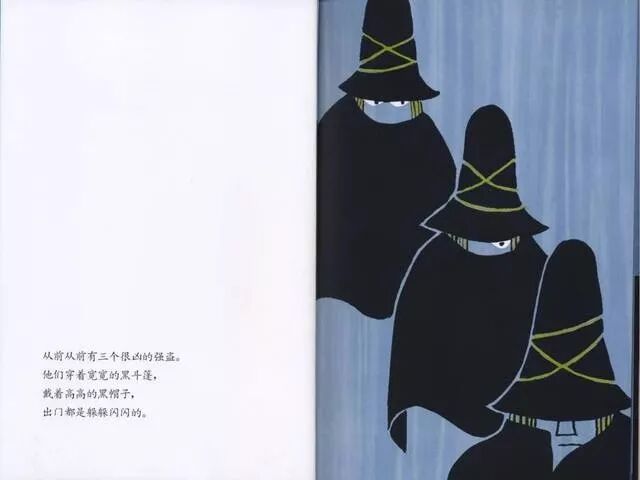 ▲《三个强盗》以强烈的颜色、概括的几何形体,来表现神秘、恐怖、冷漠或正义与热情等,让孩子通过画面氛围,感受一个有点儿吓人,又没有严肃教条的幽默故事。