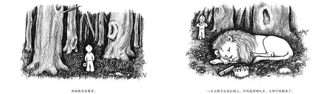 ▲《在森林里》炭笔绘本,黑白两色营造的诗意幻想世界。当孩子在森林中散步时,会跟动物们玩怎样的游戏呢?