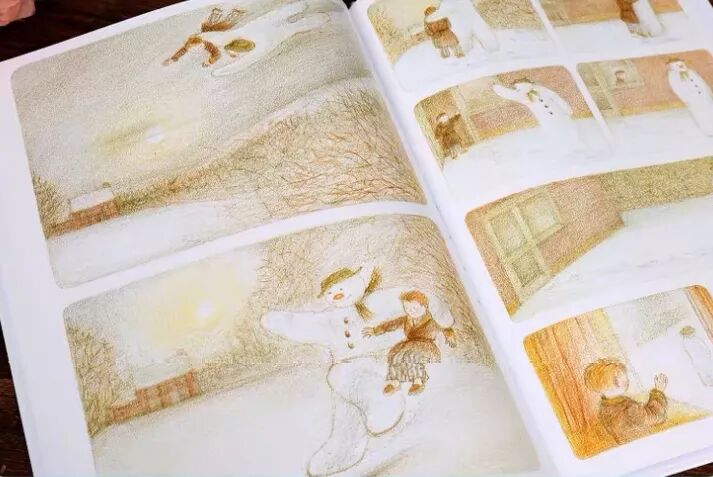 ▲《雪人》彩铅绘本,细腻的笔触营造出柔和的氛围。仿照电影分镜,刻画了24小时内的167个画面。