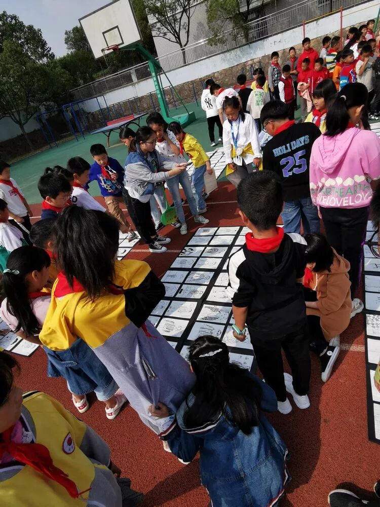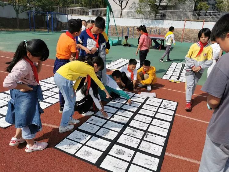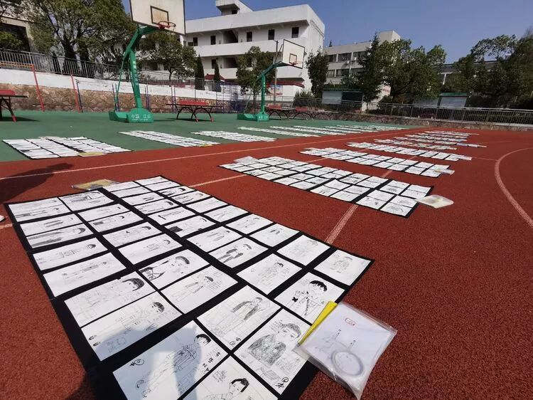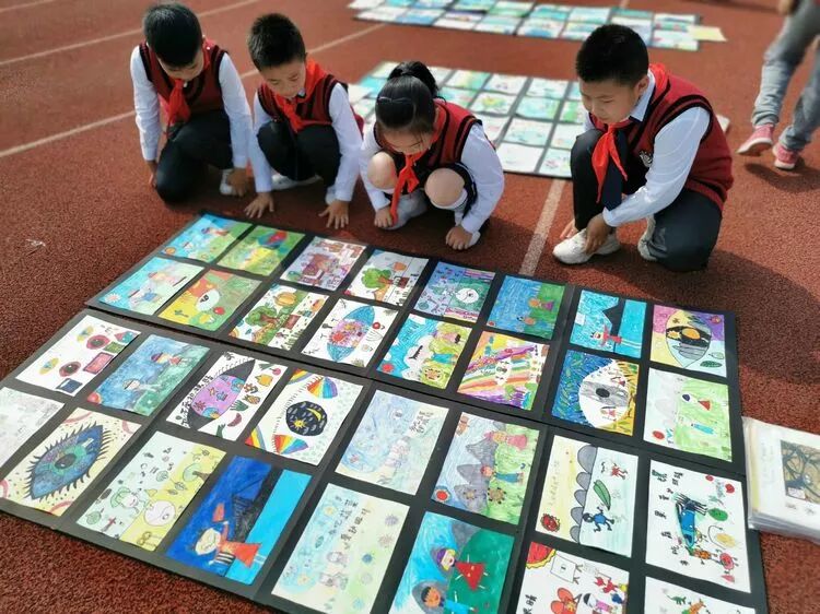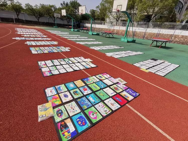 次日,将收集好的作品布展在操场上,评委们开始评画,以班级为单位评出一二三等奖
