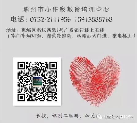 指导老师简介:刘军华,笔名白帆,1971年出生,江西吉安泰和人,2012年定居惠州;资深语文教师,广东中山大学汉语言本科,执教中小学语文31年,教研论文曾获国家级一等奖;惠州市民间文艺家协会会员,惠州市作家协会会员,文学作品见于《惠州日报》《东江时报》《东江文学》《惠州文艺》《山东诗歌》《齐鲁文学》《湖北诗歌》《湖北文学》;曾被评为“东升名师”,惠州资深作文辅导老师,惠州市小作家教育培训中心创始人,指导学生在市级报纸杂志上发表优秀作文400多篇;曾受邀到惠州市惠城区、惠东县、博罗县各中小学校上作文指导课120多场,深受广大师生的欢迎和好评。联系电话:15913888768,微信号:Xzjpx15913888768