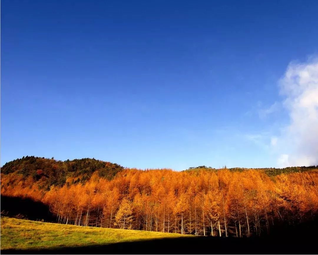 金秋的梨子坪森林公园,2万亩落叶松变得多彩和梦幻。