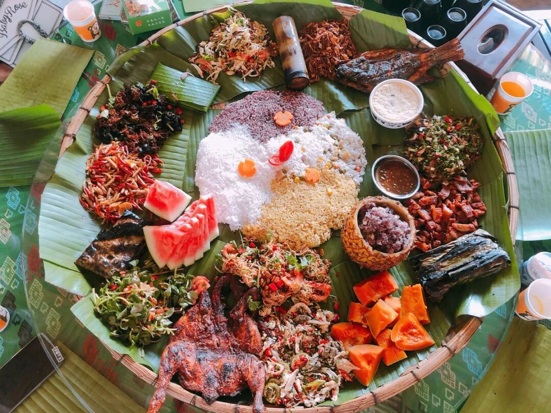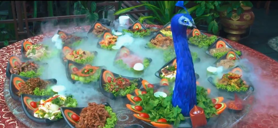 “孔雀宴”由15道菜组成,均是云南风味,香茅草烤土猪排、傣味烧肉、……将傣家人饮食文化的酸、甜、烤、辣、菌、生、虫、花、竹体现得淋漓尽致。