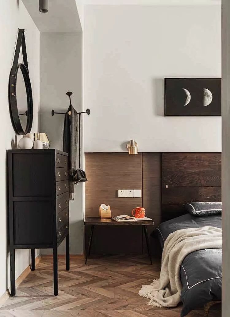 其实,床头柜的主要功能是放手机、闹钟、书或收纳一些小物品,给柜体减负,简洁小桌同样能满足。