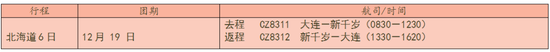 参考航班:CZ8312 新千岁-大连(1330-1620)