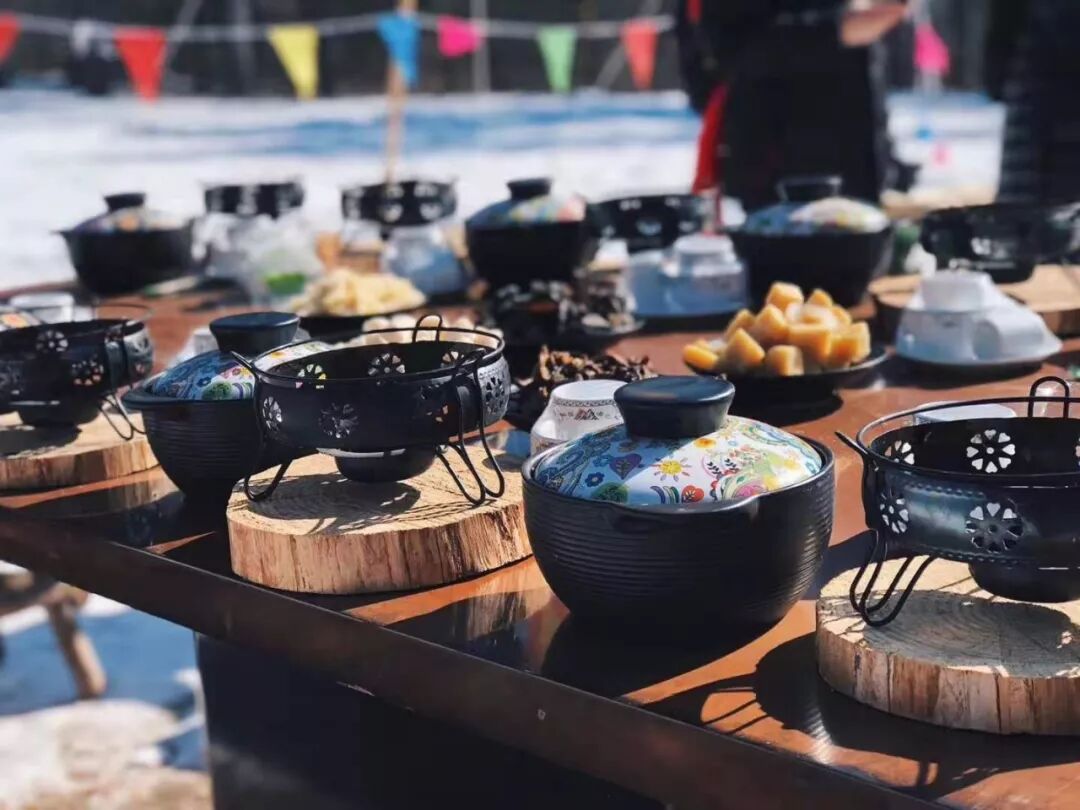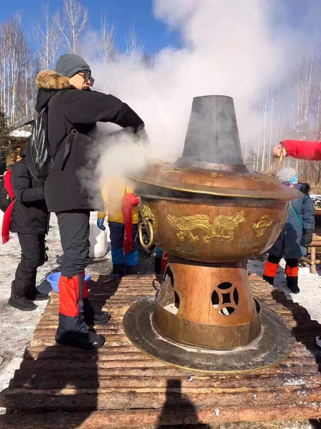 在密林中,湖泊旁,户外美食的魅力与大自然的壮美交相辉映。 有1米75高的满族乌拉大火锅将纯正的蒙古肥羊煮制成鲜美的羊汤,驱除冬日的寒意,烤制的美食也必将挑战你味蕾的极限。