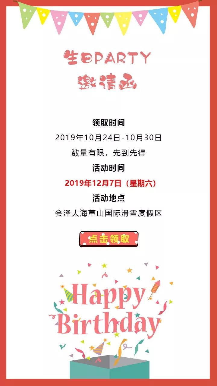 点击图片参与生日邀请函派送活动,活动共送出100份邀请函,通过好友助力可提高邀请函获得几率。邀请函使用须知1.邀请函使用时间为2019年12月7日2.邀请函包含雪场全天滑雪票一张3.邀请函仅限16周岁以下使用