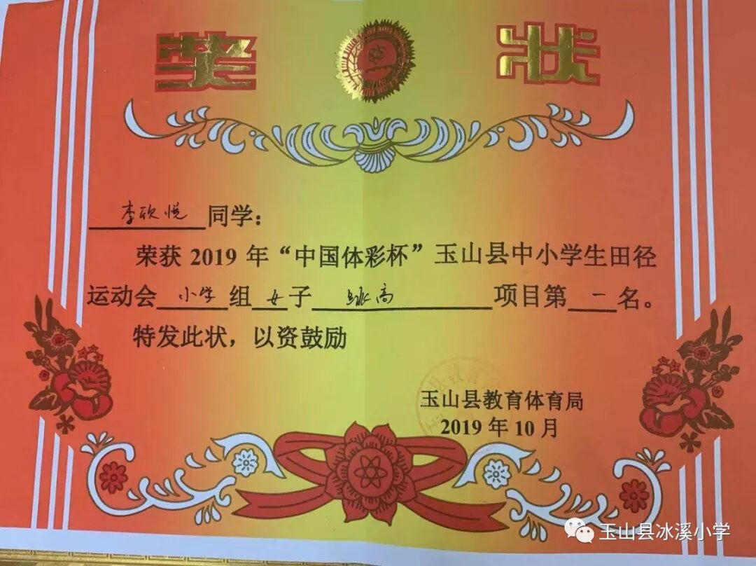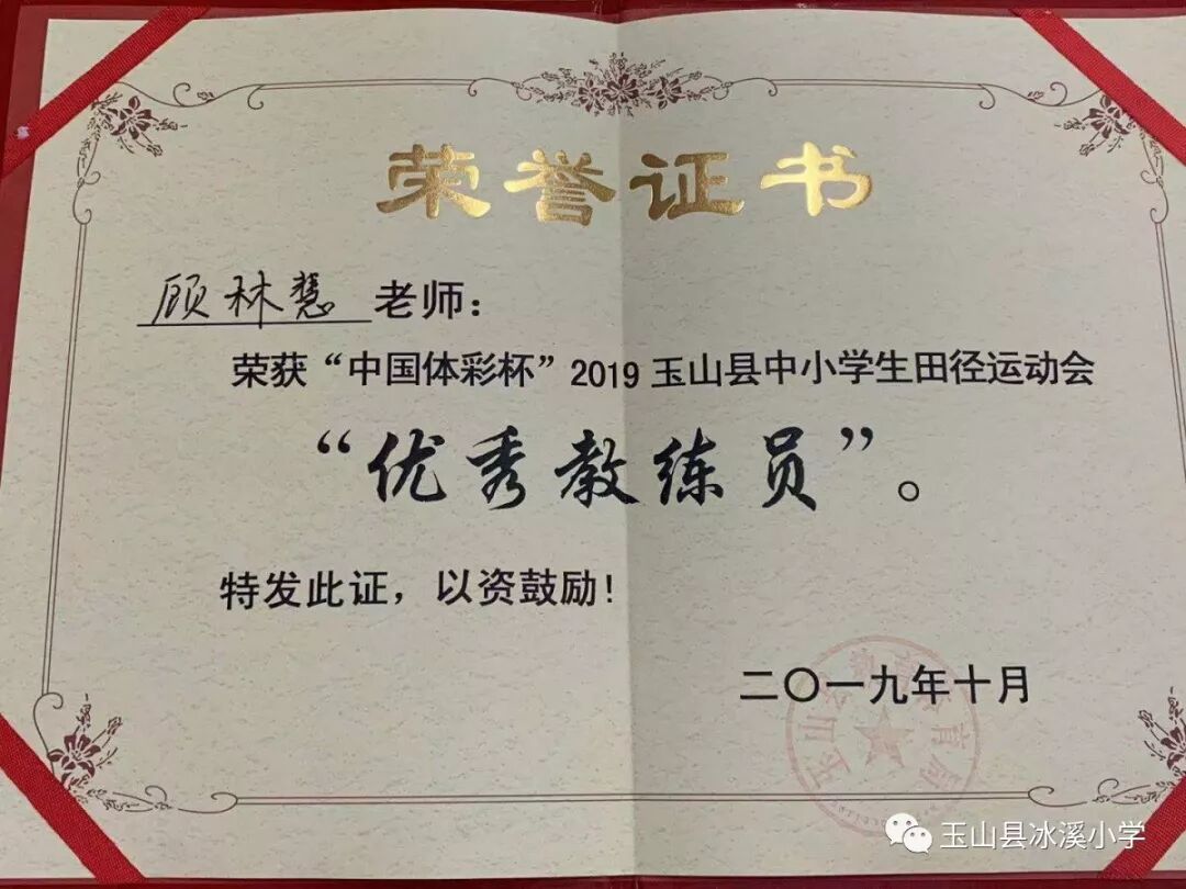 顾玲慧老师在2019年“中国体彩杯”玉山县中小学生田径运动会中被评为优秀教练员。
