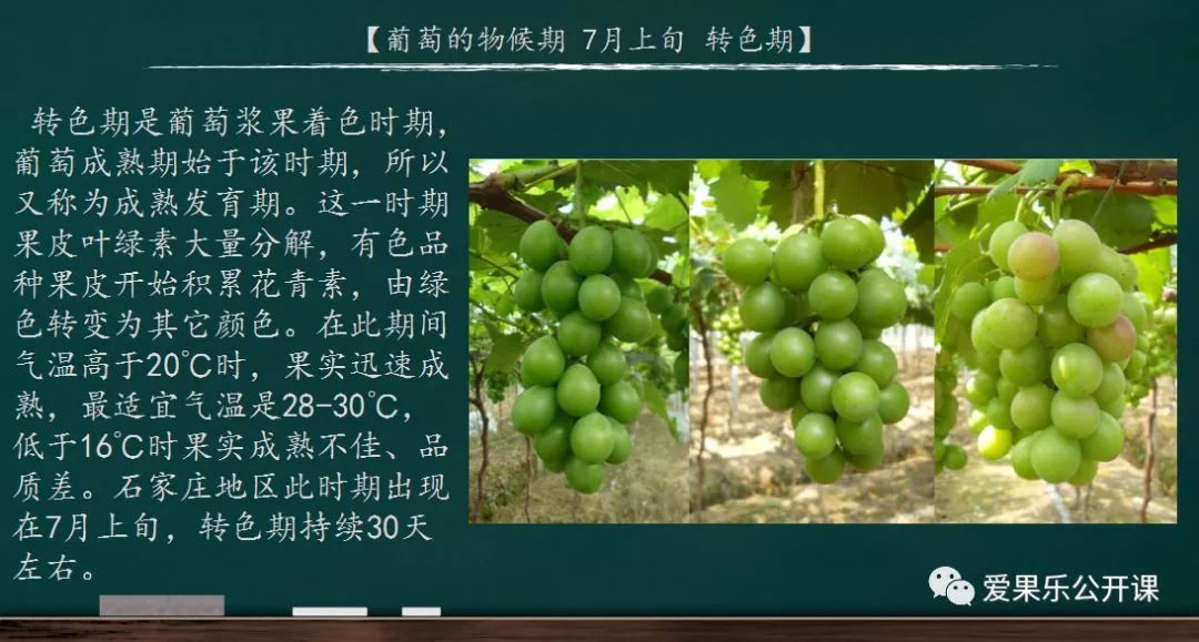 转色期是葡萄浆果着色时期,葡萄成熟期始于该时期,所以又称为成熟发育期。这一时期果皮叶绿素大量分解,有色品种果皮开始积累花青素,由绿色转变为其它颜色。在此期间气温高于20℃时,果实迅速成熟,最适宜气温是28-30℃,低于16℃时果实成熟不佳、品质差。石家庄地区此时期出现在7月上旬,转色期持续30天左右。