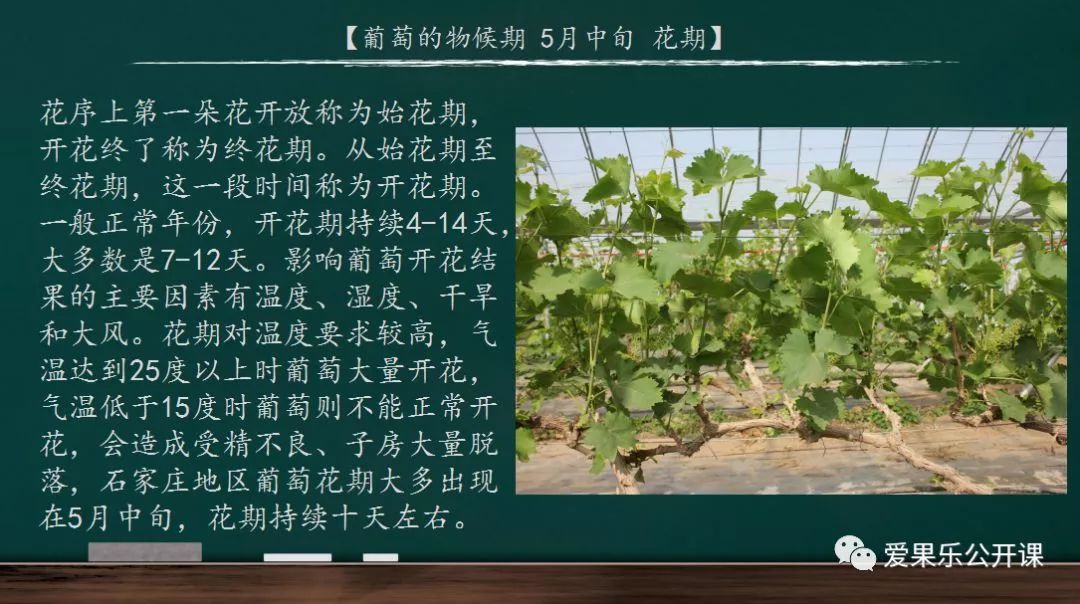 花序上第一朵花开放称为始花期,开花终了称为终花期。从始花期至终花期,这一段时间称为开花期。一般正常年份,开花期持续4-14天,大多数是7-12天。影响葡萄开花结果的主要因素有温度、湿度、干旱和大风。花期对温度要求较高,气温达到25度以上时葡萄大量开花,气温低于15度时葡萄则不能正常开花,会造成受精不良、子房大量脱落,石家庄地区葡萄花期大多出现在5月中旬,花期持续十天左右。