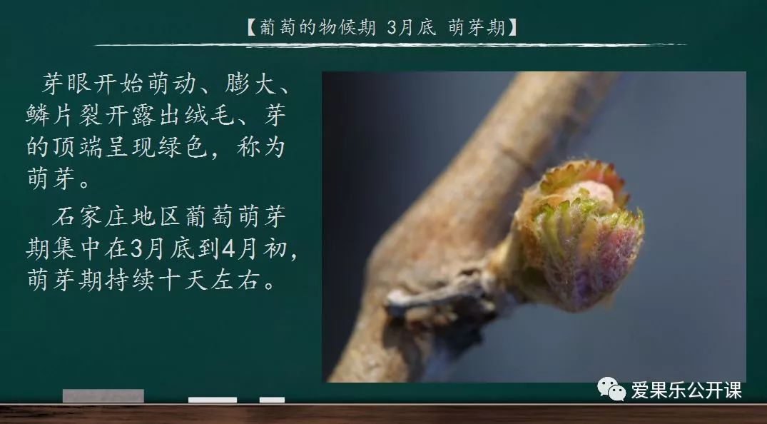 芽眼开始萌动、膨大、鳞片裂开露出绒毛、芽的顶端呈现绿色,称为萌芽。石家庄地区葡萄萌芽期集中在3月底到4月初,萌芽期持续十天左右。