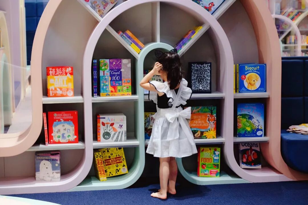 奈尔宝经典的地方有很多,但是阅读区绝对是最经典的!藏书整整2万多册,中英书的比例差不多1:1,无论喜欢什么语言的孩子,都能找到自己喜欢的一款。“ 一进入是绘本区,配有很多阅读区,可以坐椅子上,也可以藏在圆形的洞里也可以看软垫上,中英文都有,数量很多。碰到喜欢的绘本还可以买回家。”