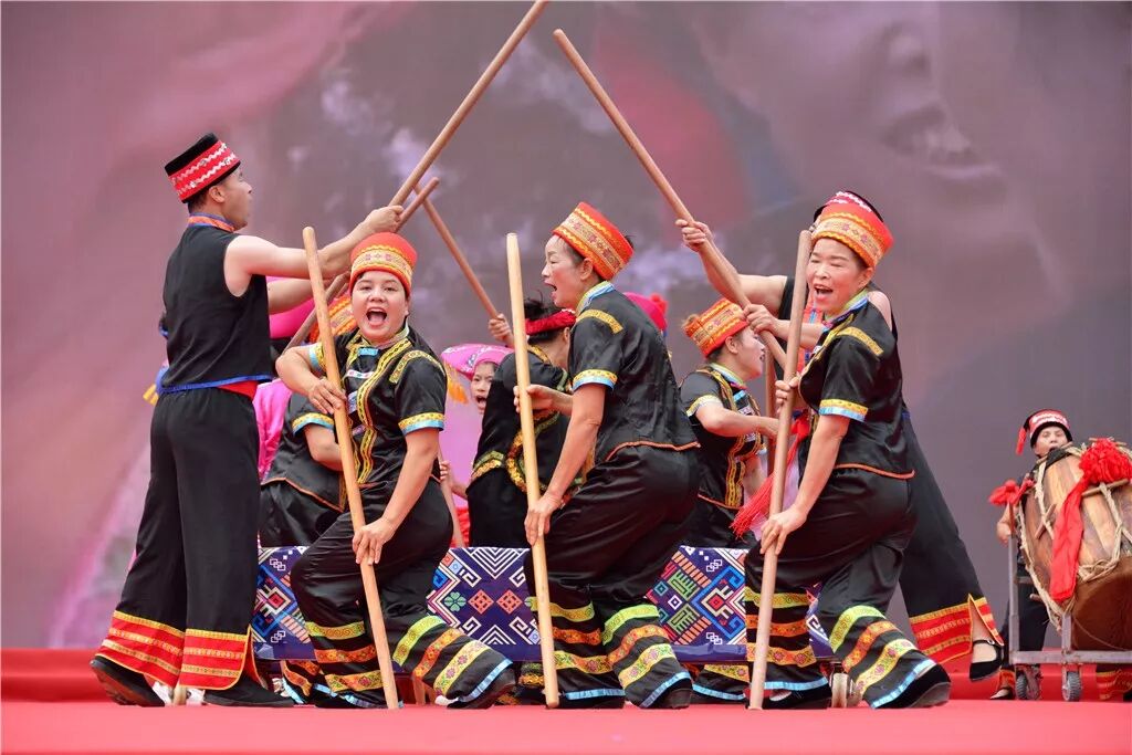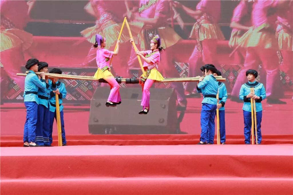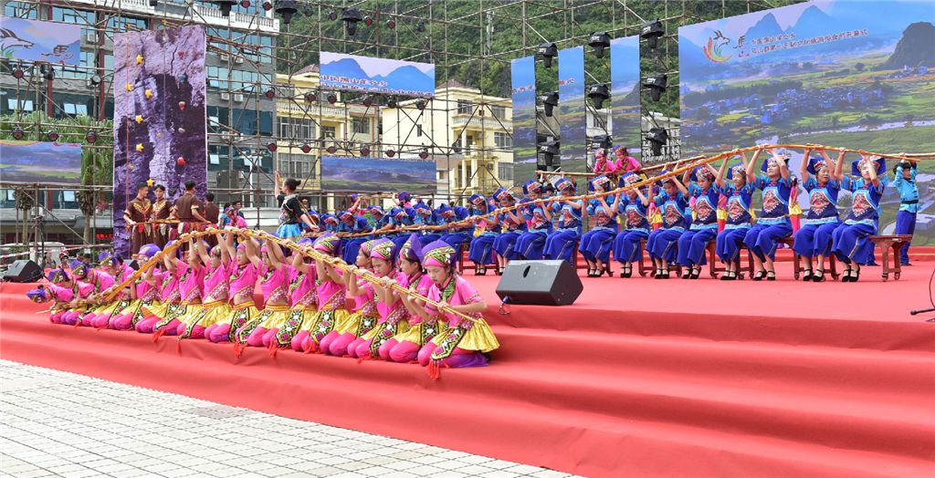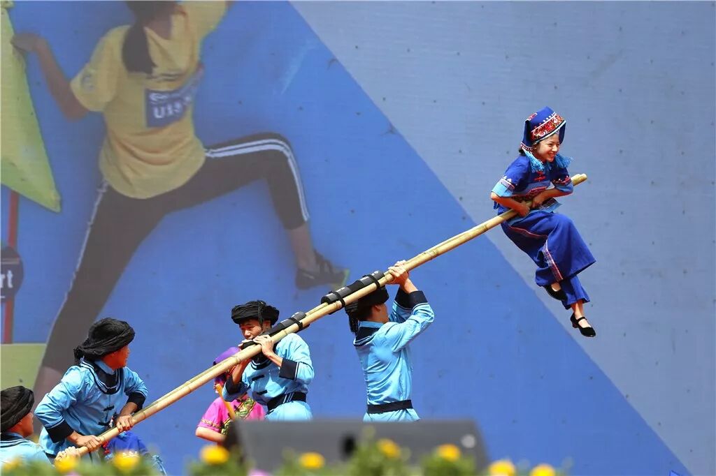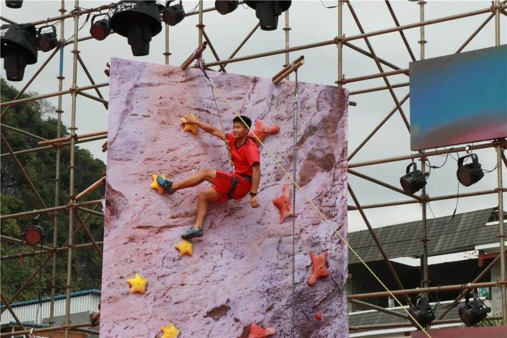 打扁担是马山文化四宝其中的一个特色文化品牌,有“广西民间舞蹈一支花”的美称。攀岩特色小镇落户马山,不但让攀岩这项运动在马山兴起,也使我县“体育+文旅+扶贫+县域经济”的发展模式得到深化。场景寓意表演节目《攀岩小镇·爱的彩虹桥》,运用打扁担加花式艺术打法与攀岩动作有机结合进行演出,同台展示了扁担舞的魅力和攀岩小镇这一蓬勃发展的特色乡村旅游资源。