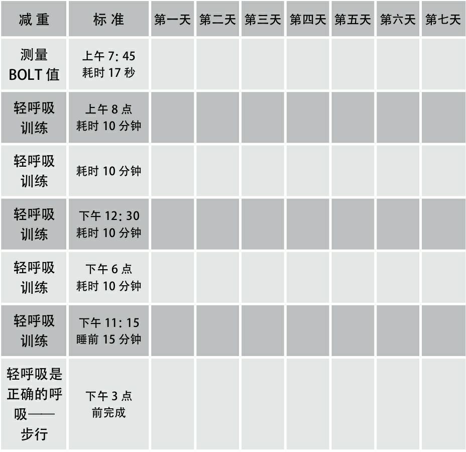 需要重申的是,有健康问题的人或BOLT值在10秒以下、有强烈的呼吸需求的人不要做屏息训练,有可能因为控制不了呼吸而出现症状恶化的状况。同时也不要尝试做疏通鼻塞训练,或其他模拟高海拔训练,直至BOLT值提高到10秒以上。还有跑步时的屏息训练,应等BOLT值达到20秒以上后再开始进行。