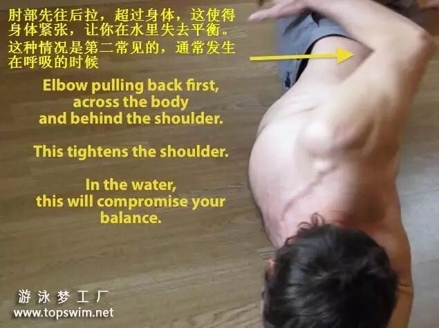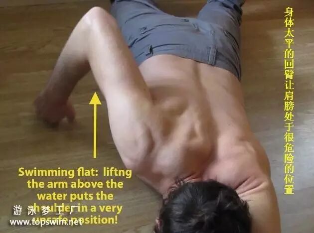 If you areswimming flat, any attempt to lift your elbow above the water will result in atightening of the shoulder and potentially shoulder impingement. (see the firstphoto above)