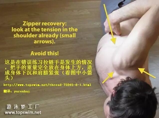 避免拉链手练习。在陆地上做这个练习。移臂时要避免肘部过高,除非你是超级柔韧性的奥运选手或者是能负担肩部手术费用的铁人三项运动员。