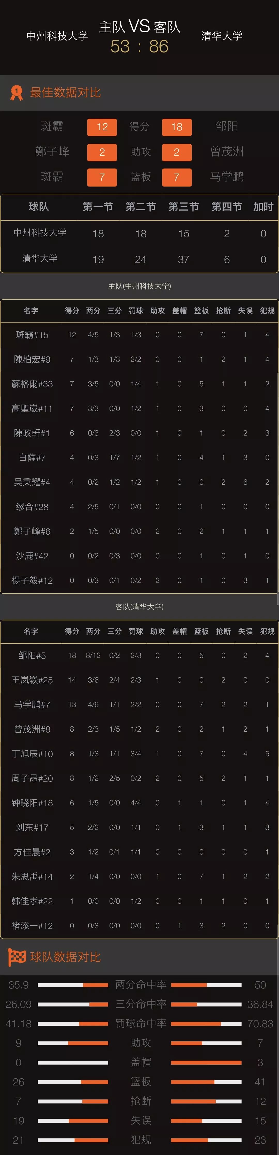 末节开始,清华大学降低进攻节奏稳扎稳打,而中州科技大学始终解决不了得分问题,清华大学5#邹阳轻松拿下4分,随着比赛时间的消逝,清华大学牢牢把控比赛节奏,终场结束清华大学以86:53拿下开门红