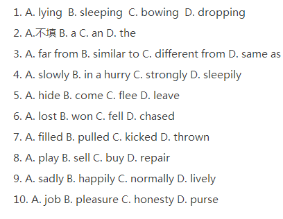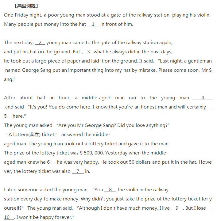 可见,完形填空是一种综合性较强的题型。它的突出特点是起点高、容量大。同学们只有具备了扎实的语言基本功、较好的阅读能力及归纳判断能力,才能适应这一题型。