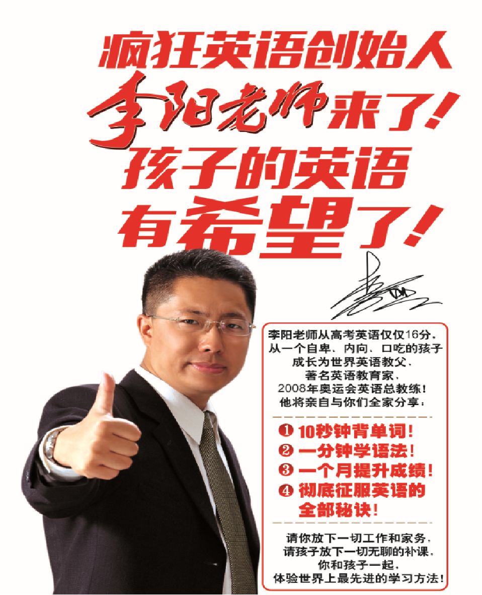 一、李阳疯狂英语绝对不是一般的培训班、补习班!疯狂英语是世界领袖的培养摇篮!一次参加,彻底改变孩子的一生!