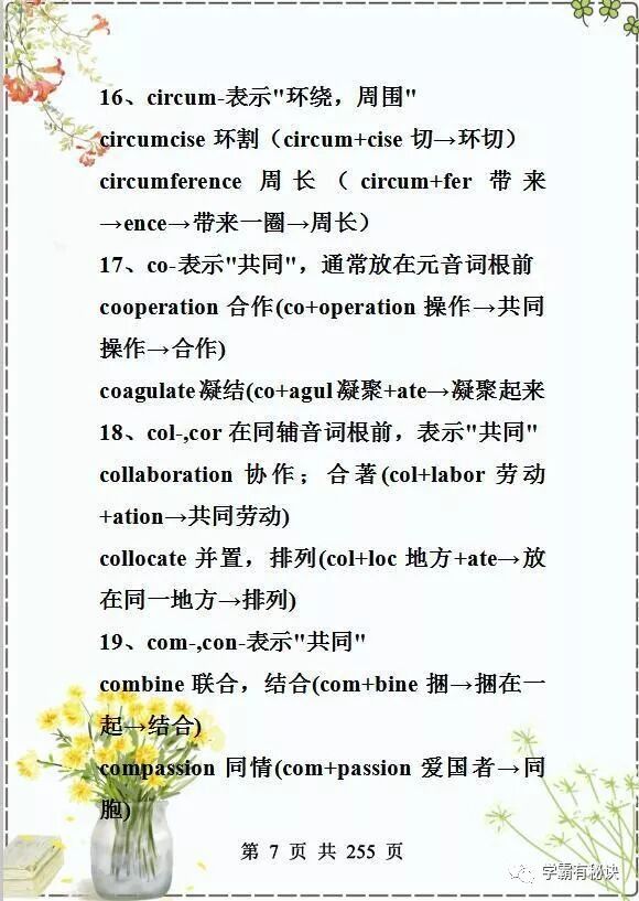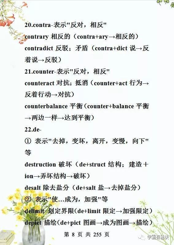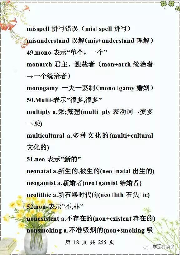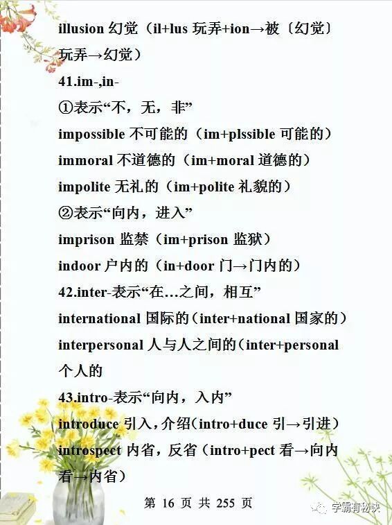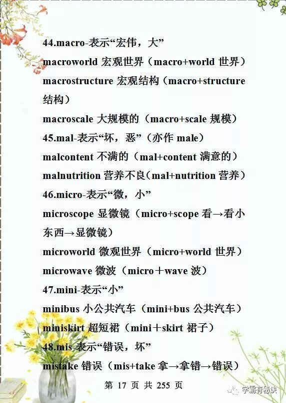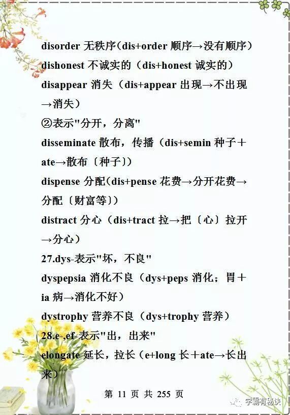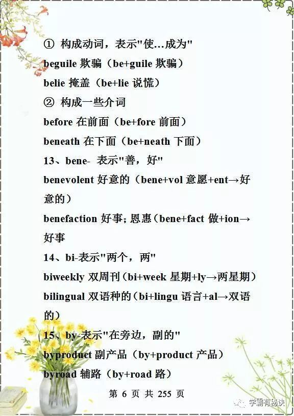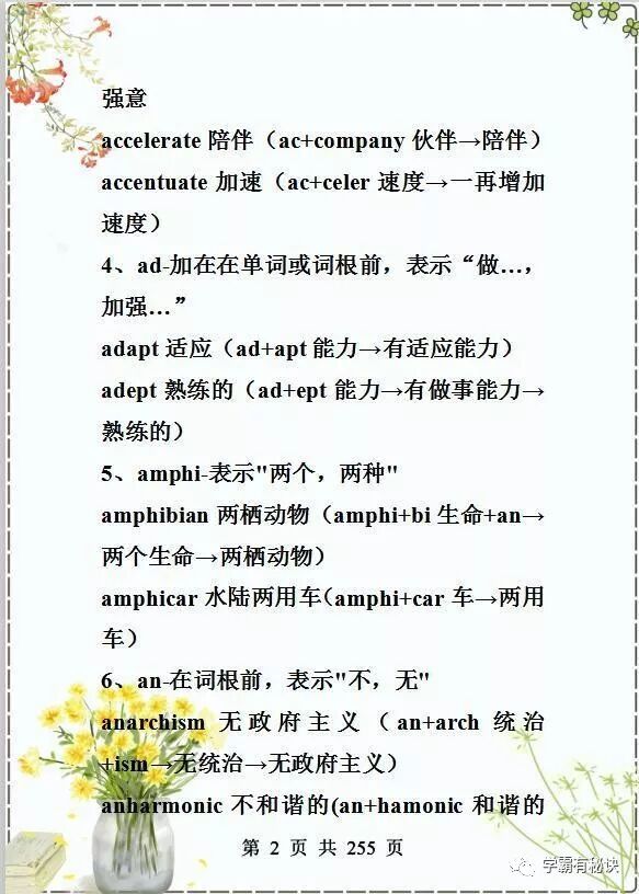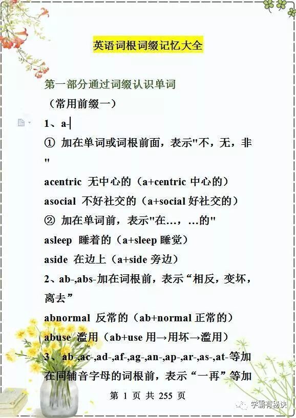 下面,为了帮助孩子们可以记好单词,学好英语,提高成绩,老师特意为大家总结了一份关于我们英语单词一个词根词缀记忆法,建议家长们都为孩子收藏一份,相信这对于孩子在英语单词这块上的记忆定会有很大帮助的。英语老师直言:苦背单词9年,不如记住这255张图,120分都随便考!