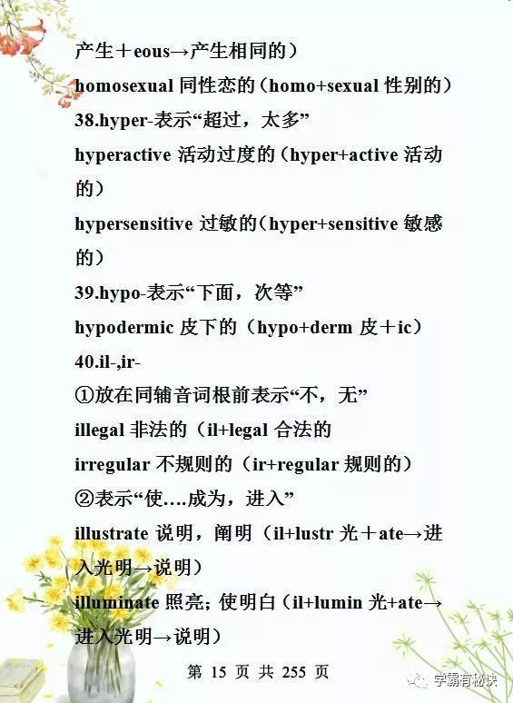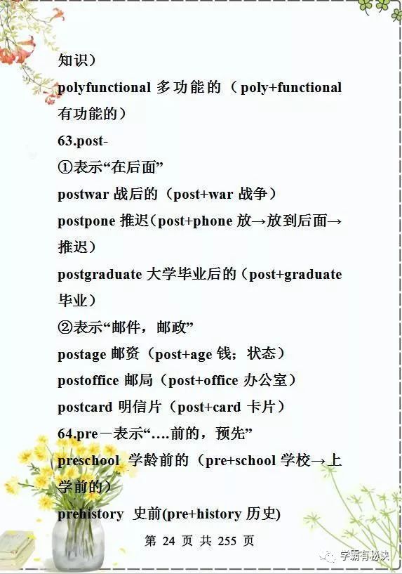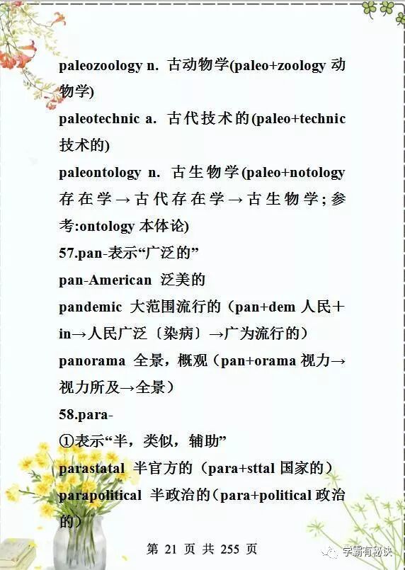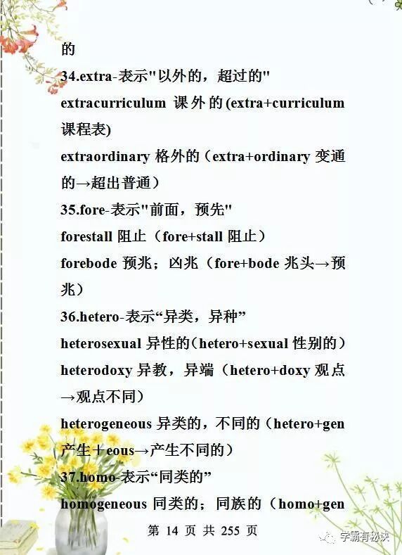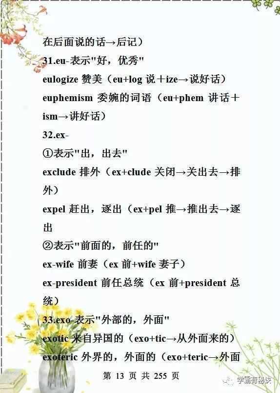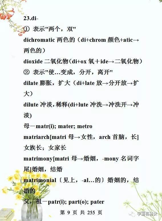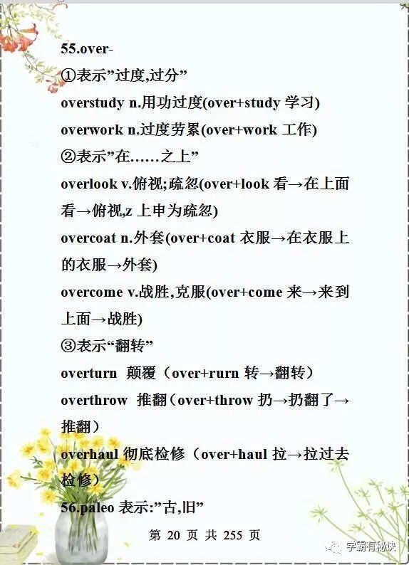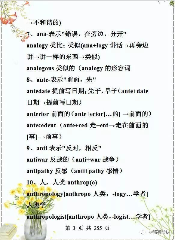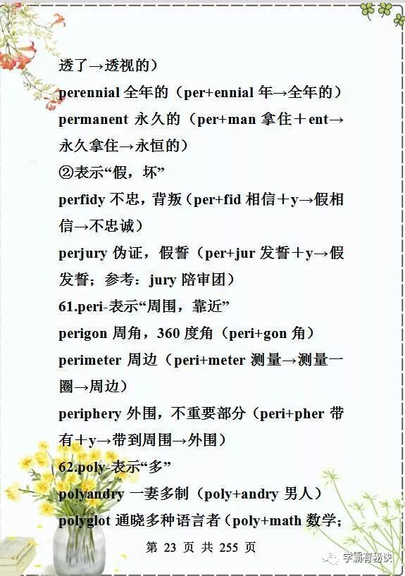 下面,为了帮助孩子们可以记好单词,学好英语,提高成绩,老师特意为大家总结了一份关于我们英语单词一个词根词缀记忆法,建议家长们都为孩子收藏一份,相信这对于孩子在英语单词这块上的记忆定会有很大帮助的。英语老师直言:苦背单词9年,不如记住这255张图,120分都随便考!
