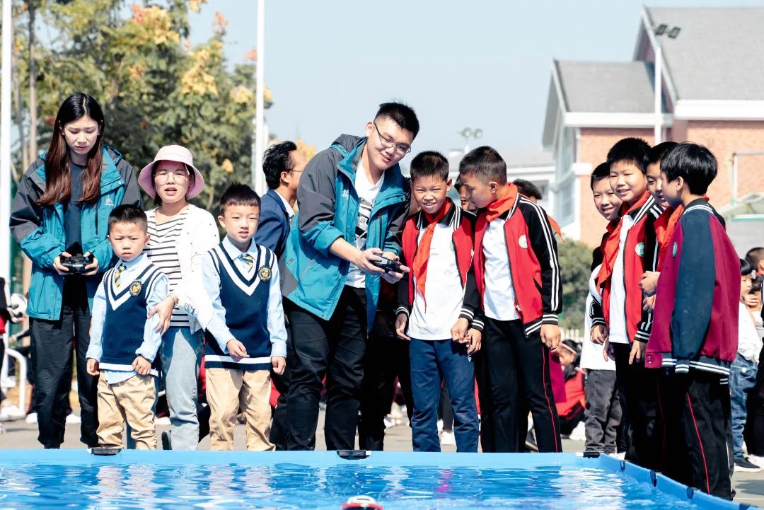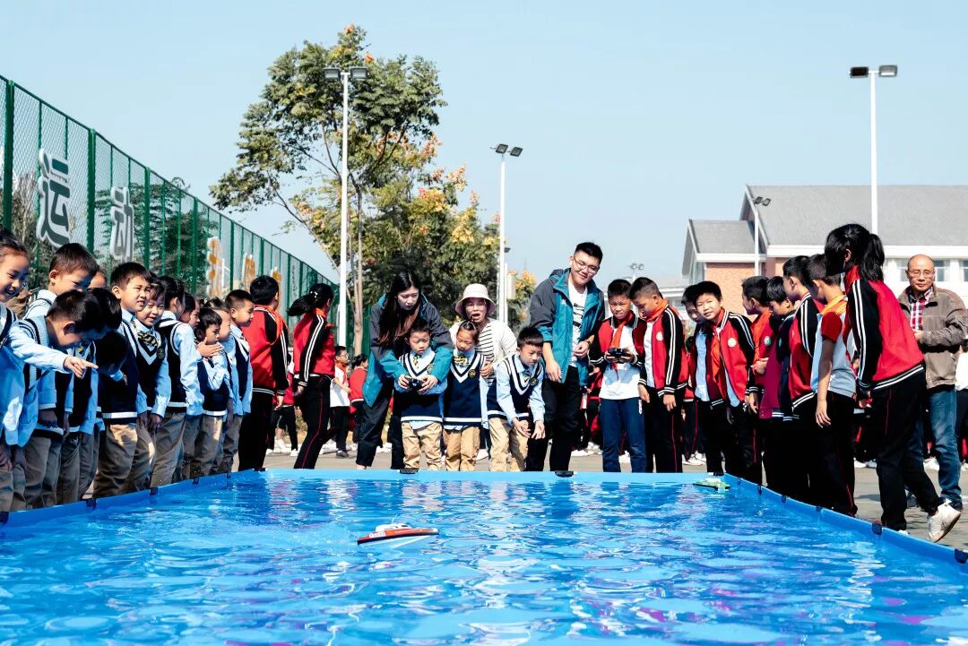 “瞧,我们的轮船启航啦!”省海模队的老师正在指导孩子操控海模。