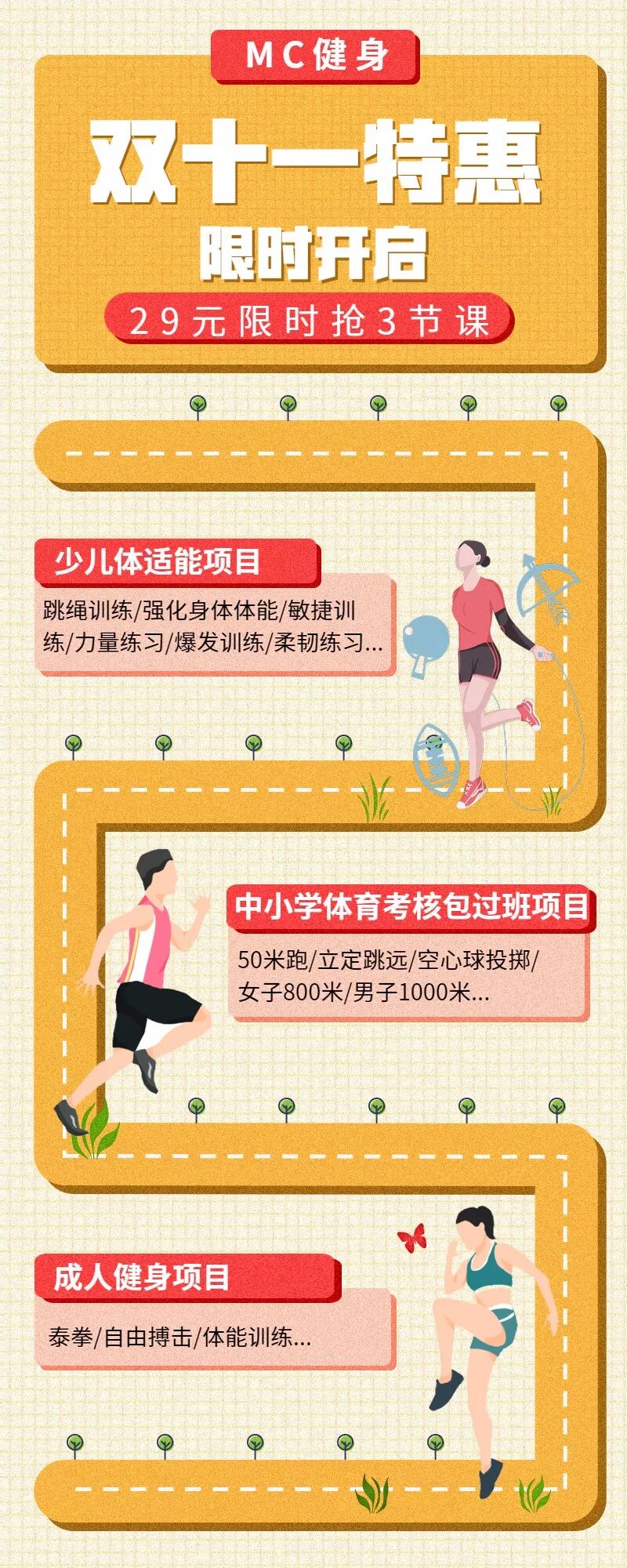 套餐内容:29元抢MC健身原价1140元健身课程3节课(少儿体适能、中小学体育考核包过班、成人拳击/成人自由搏击三选一)◆ 少儿体适能项目:1、跳绳训练;2强化身体体能;3、敏捷训练;4、力量练习;5、爆发训练;6、柔韧练习◆中小学体育考核包过班项目:1、50米跑;2、立定跳远;3、空心球投掷;4、女子800米;5、男子1000米◆成人项目:拳击、自由搏击、体能训练